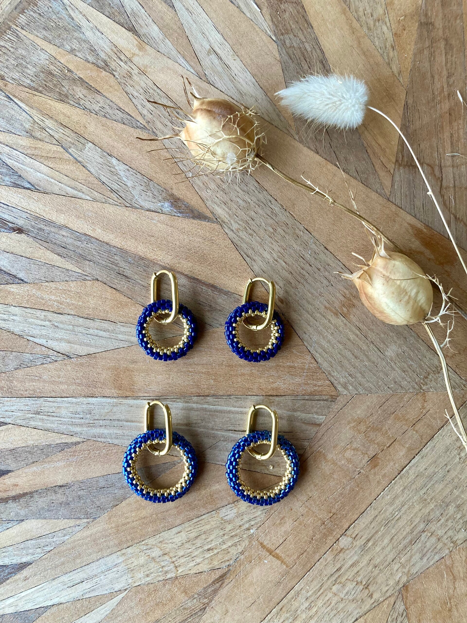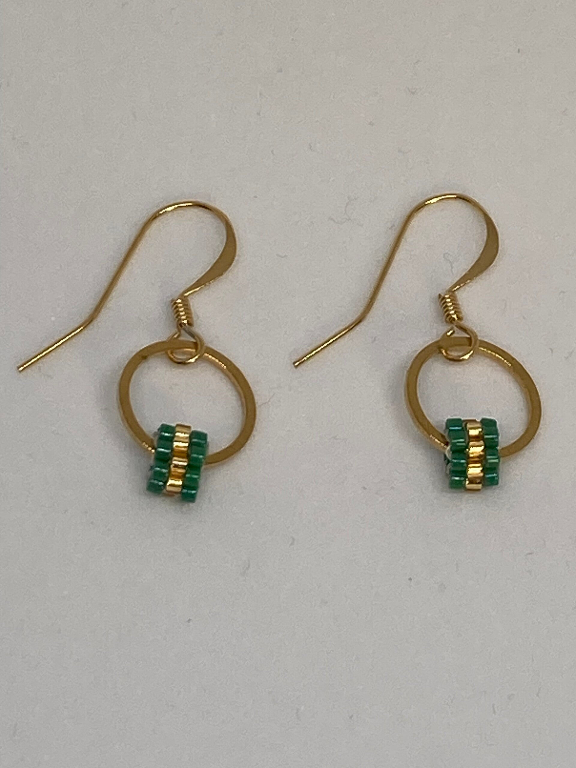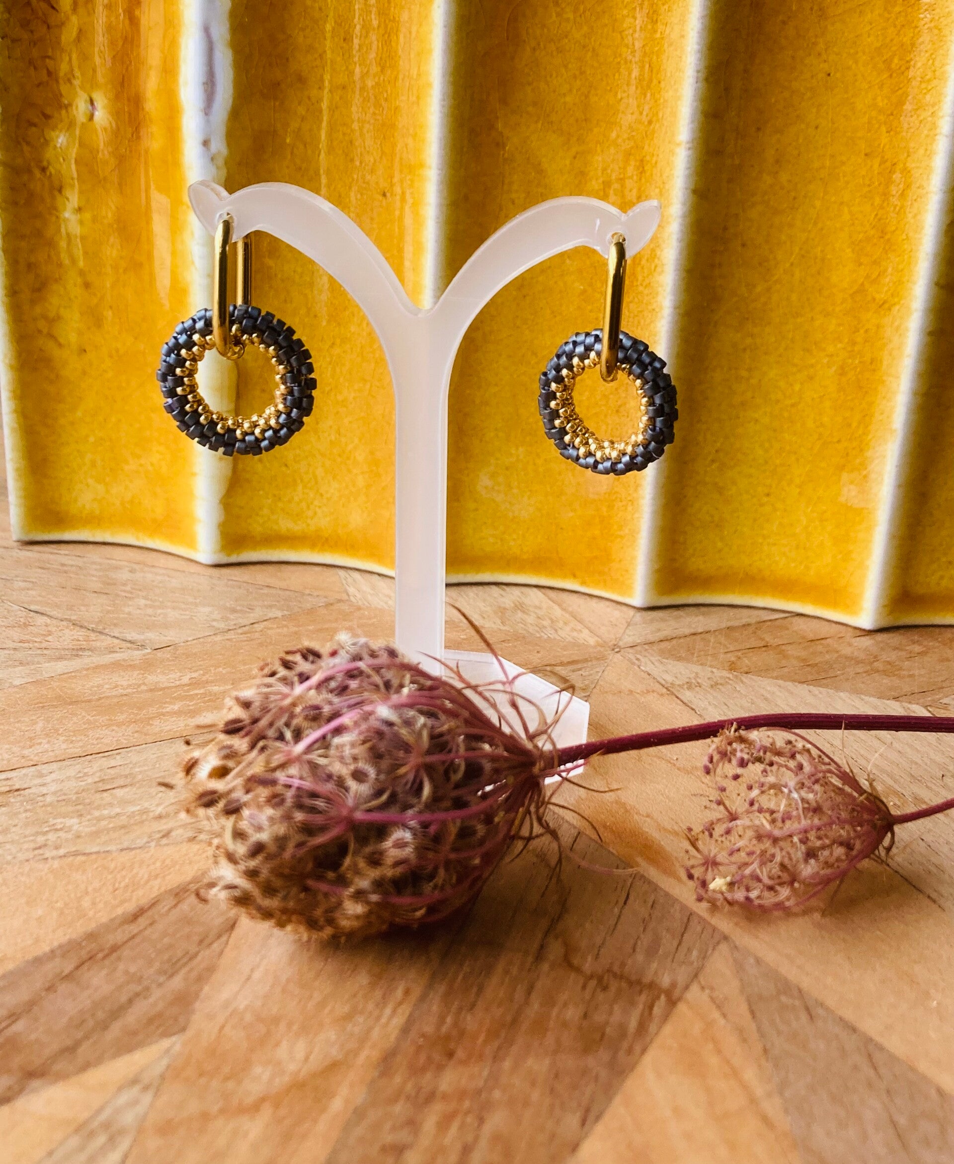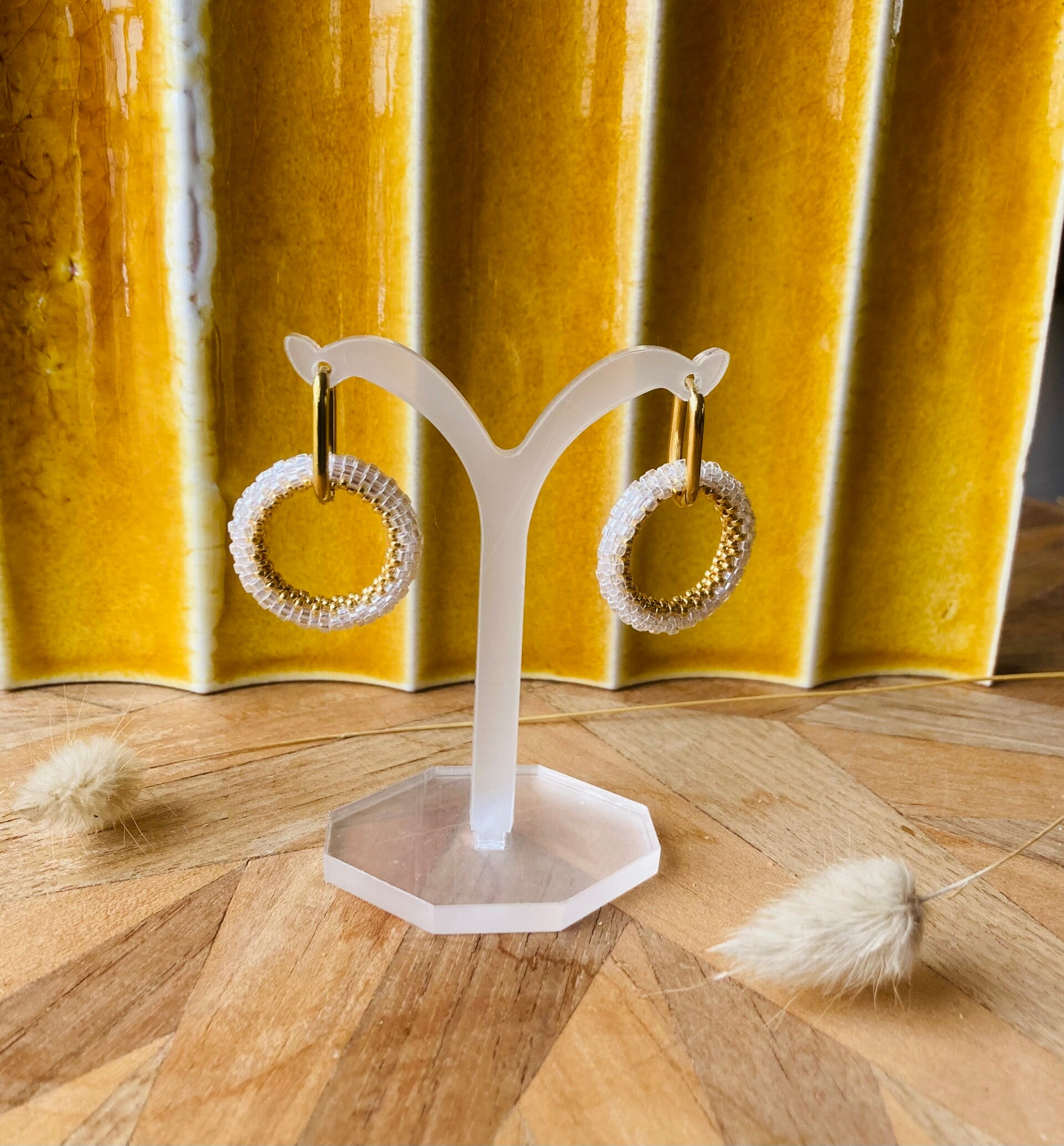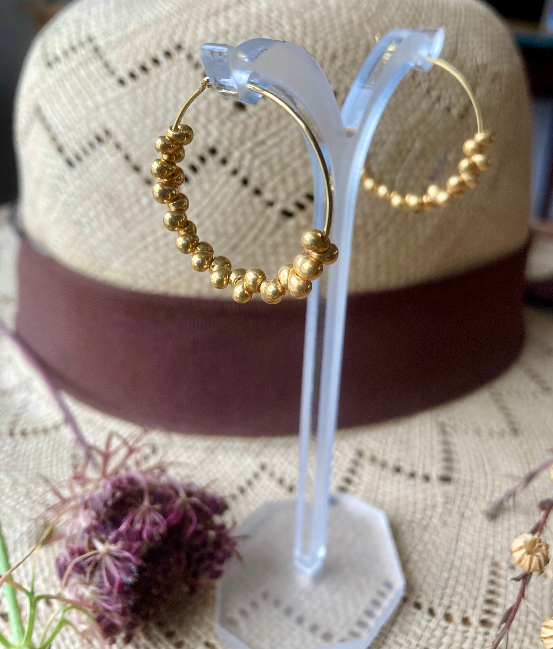 Clous d’oreilles, anneau martelé doré à l’or fin, passant en titanium, perles en verre, fil nylon
