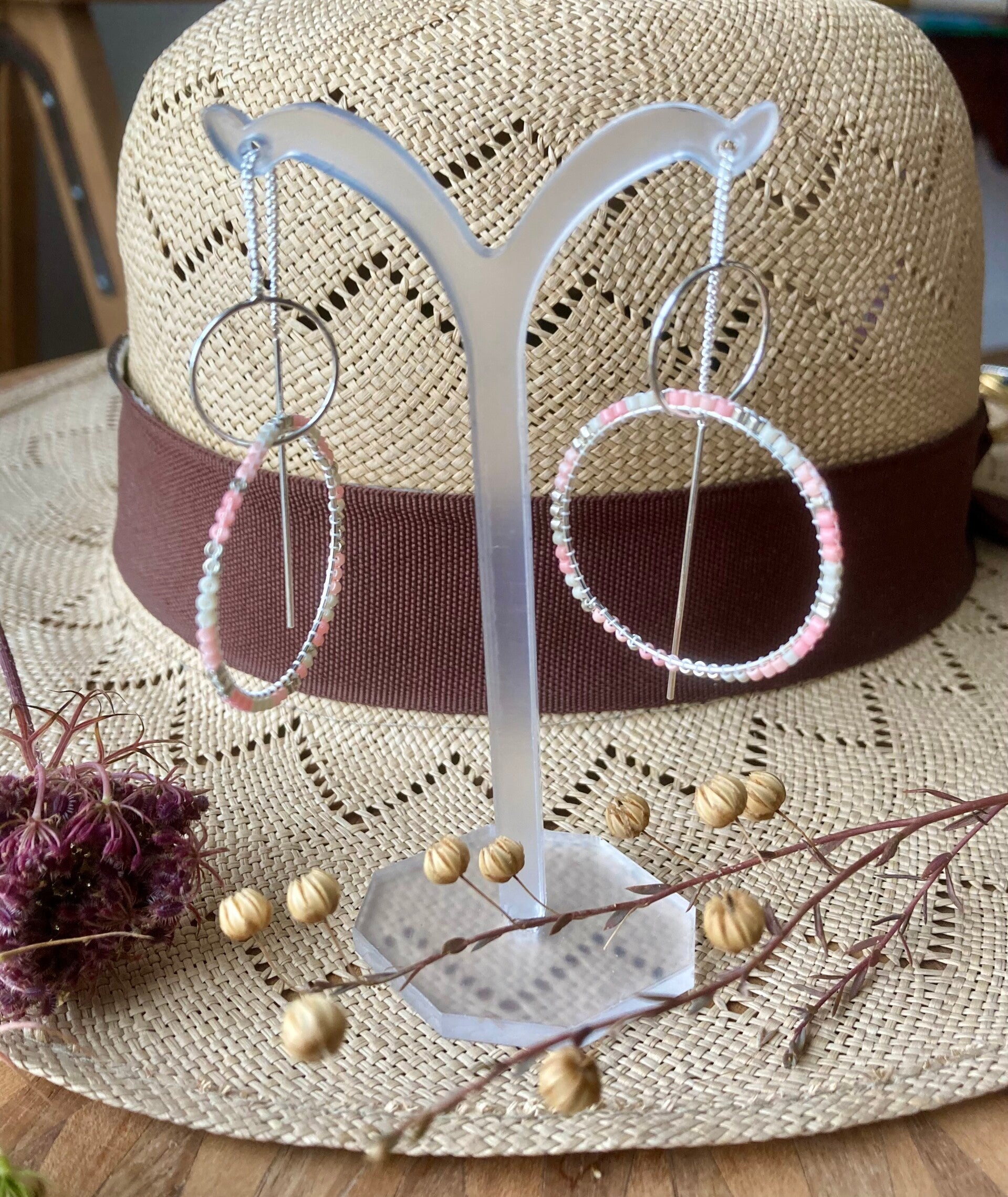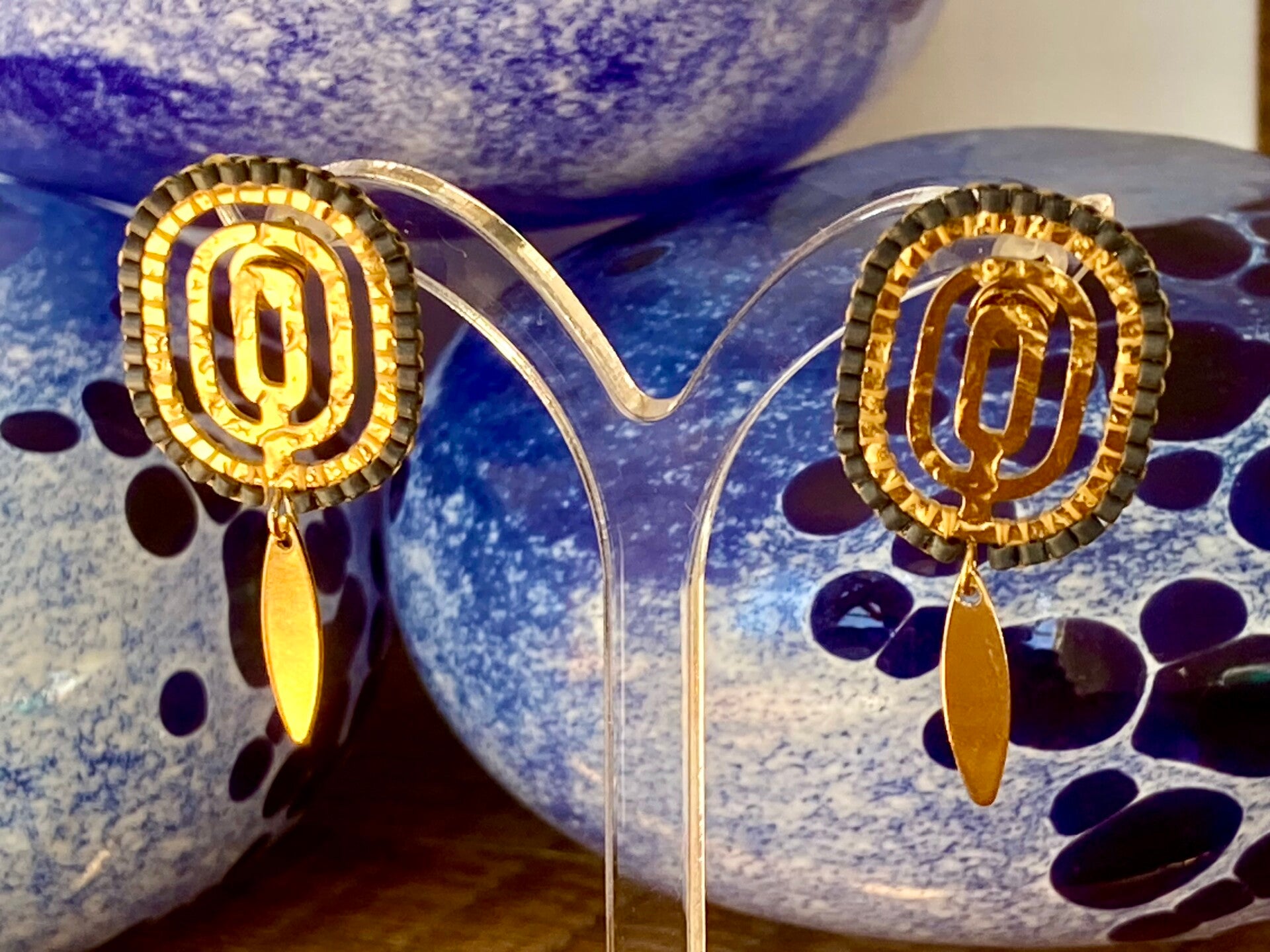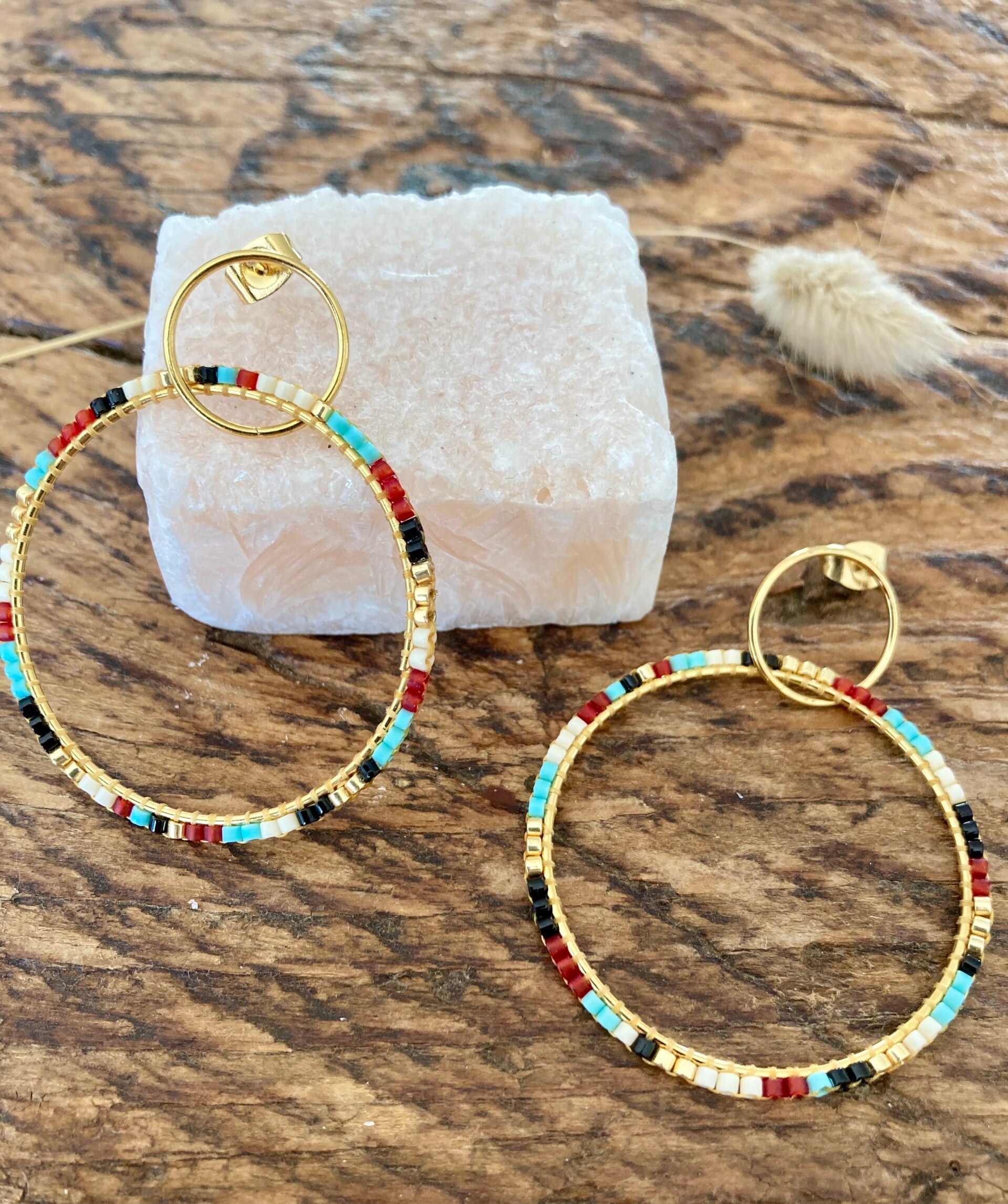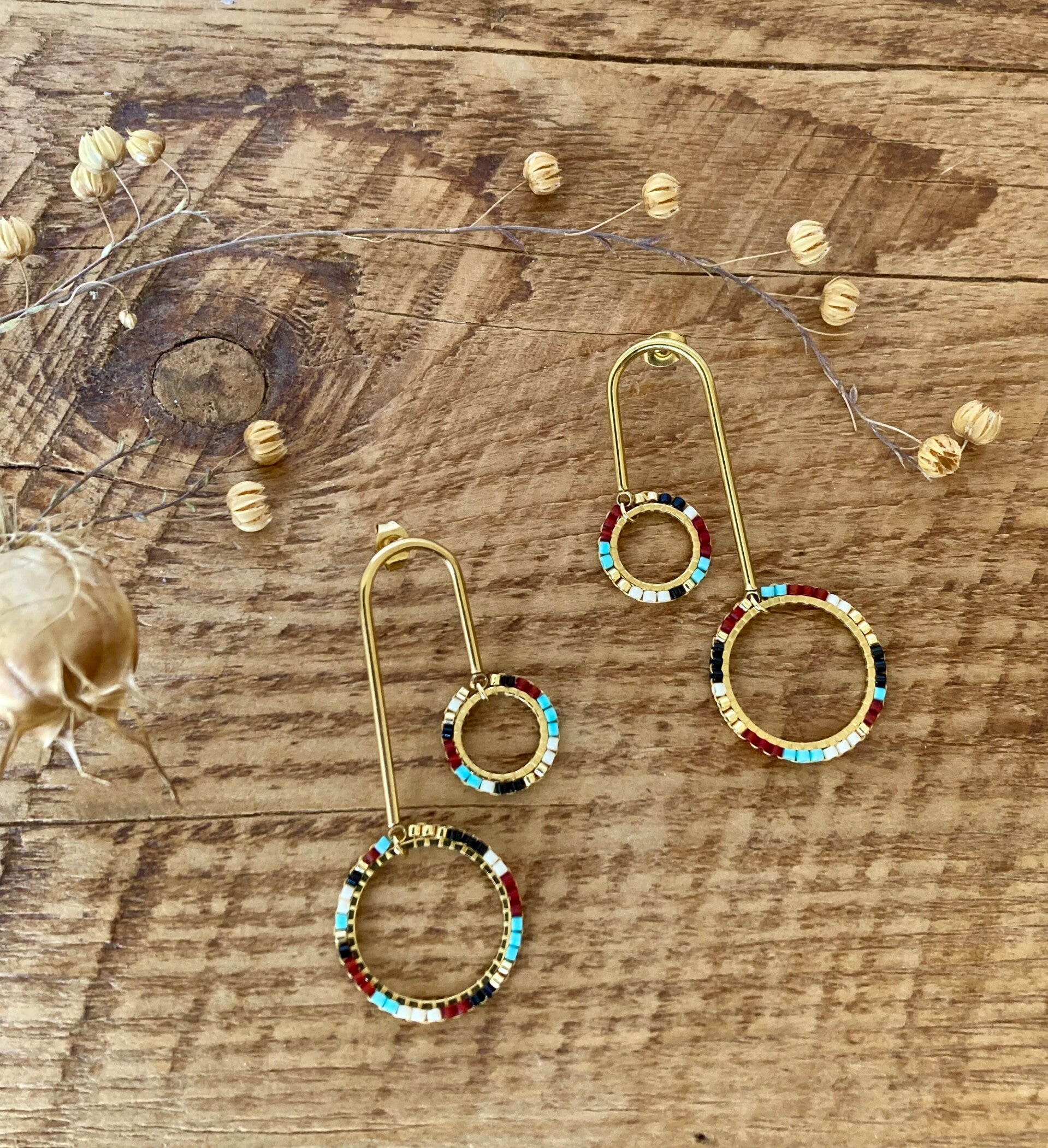 Clous d’oreilles, anneau martelé doré à l’or fin, passant en titanium, perles en verre, fil nylon