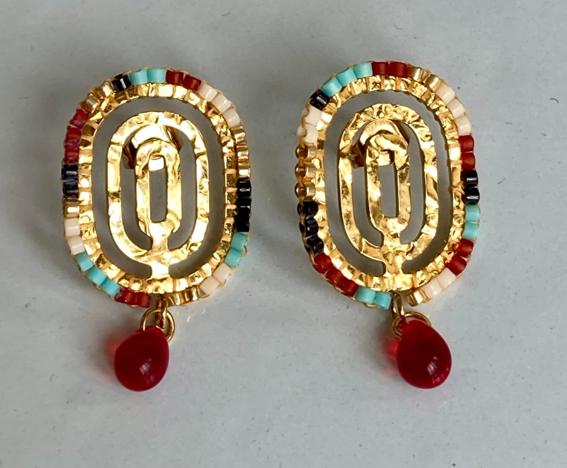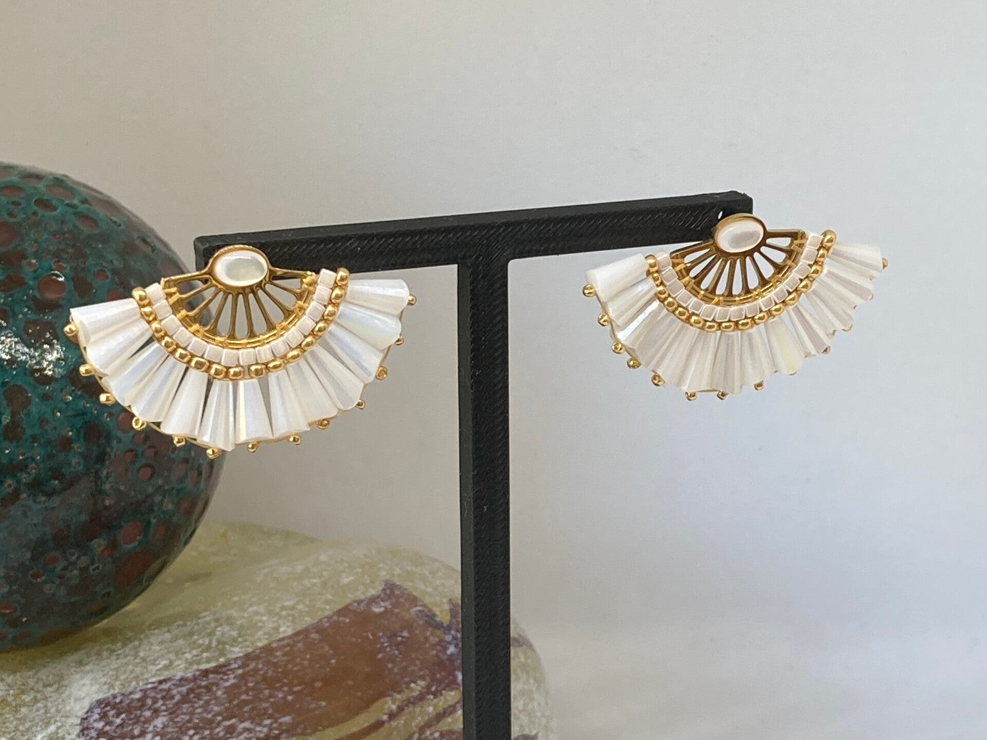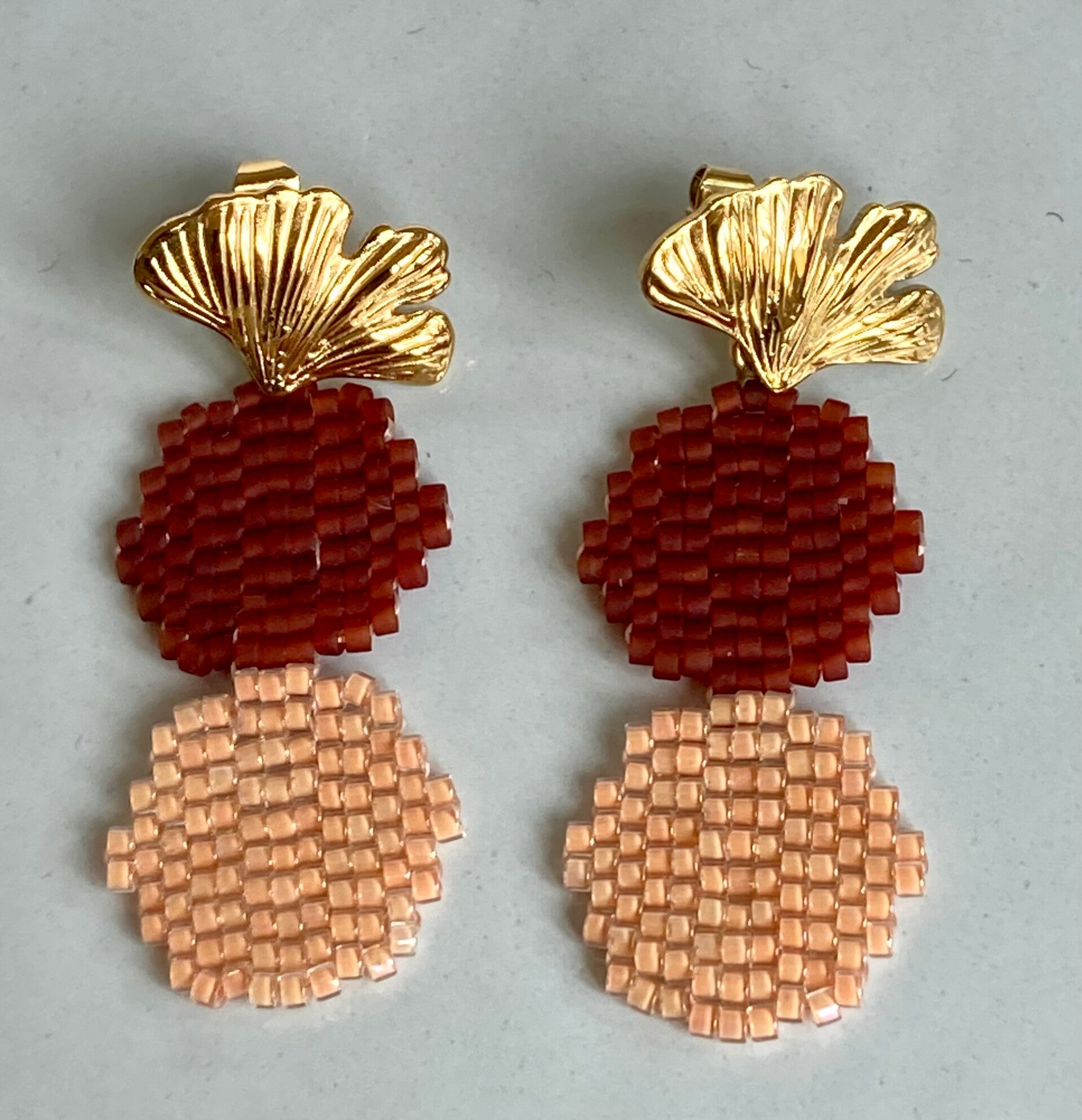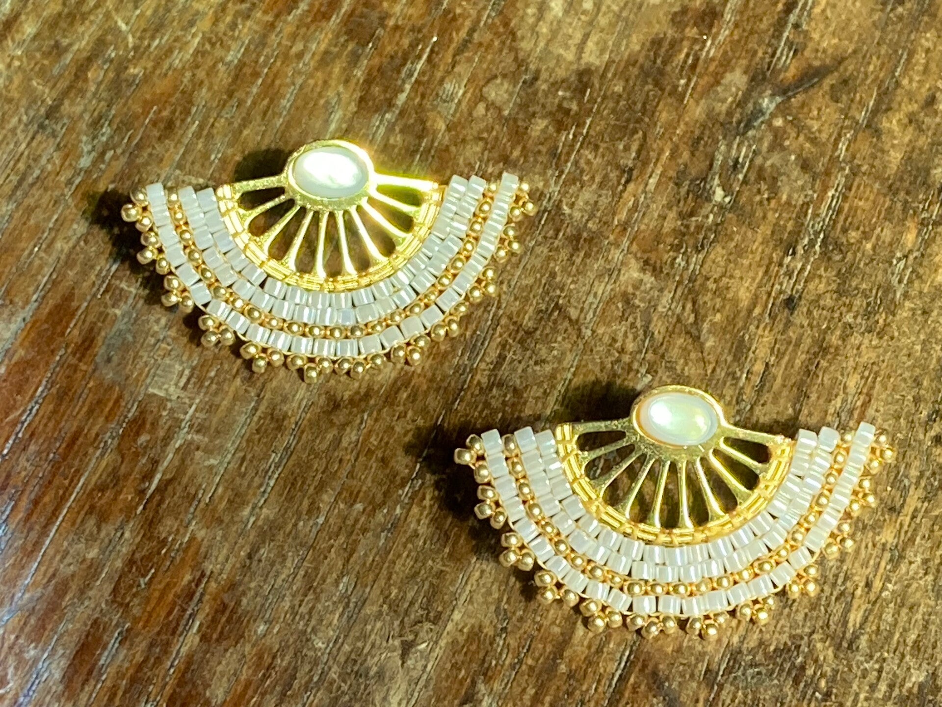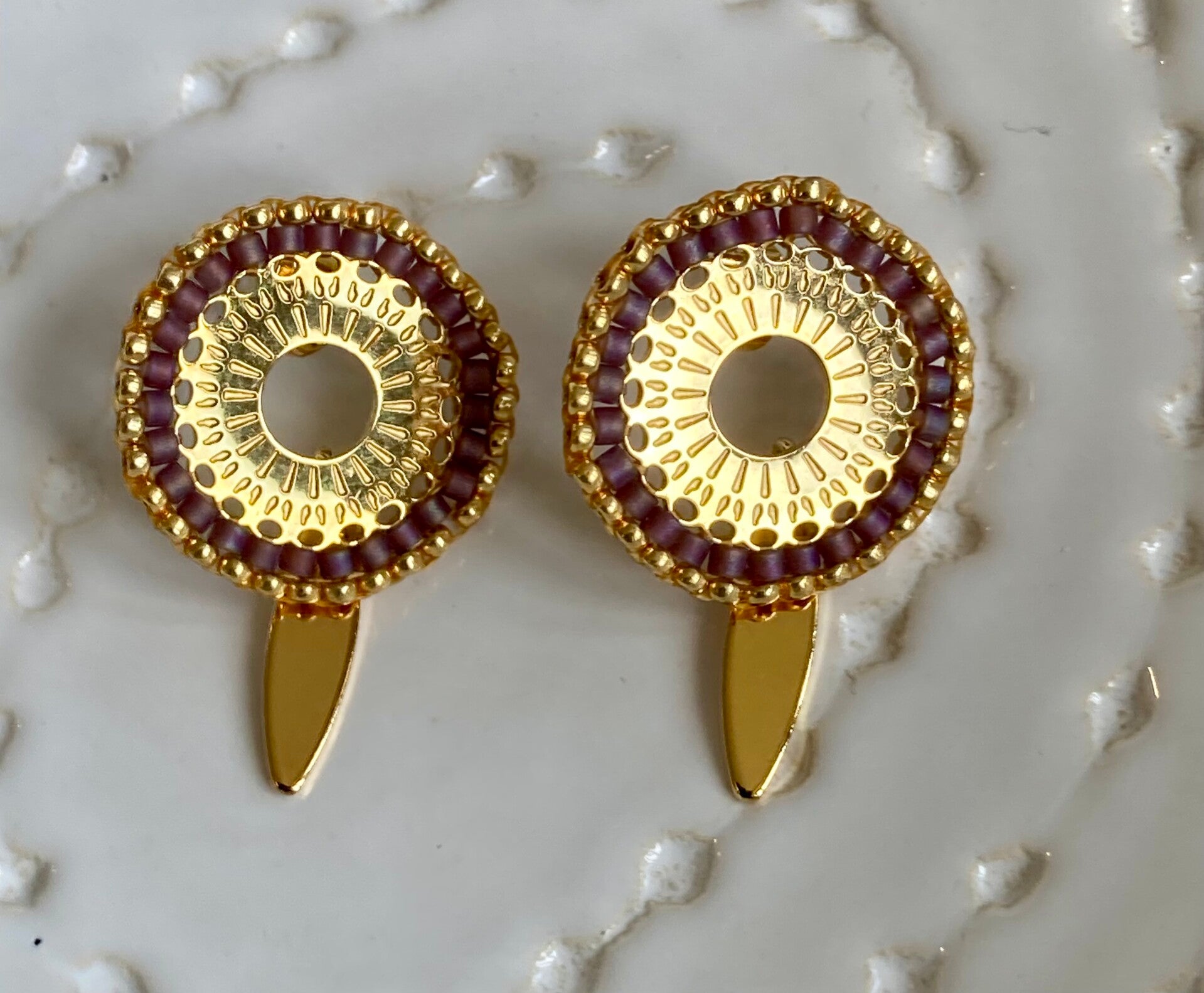 Clous d’oreilles, anneau martelé doré à l’or fin, passant en titanium, perles en verre, fil nylon