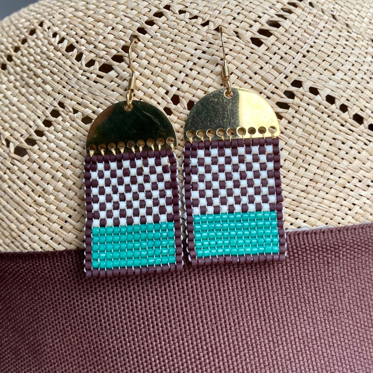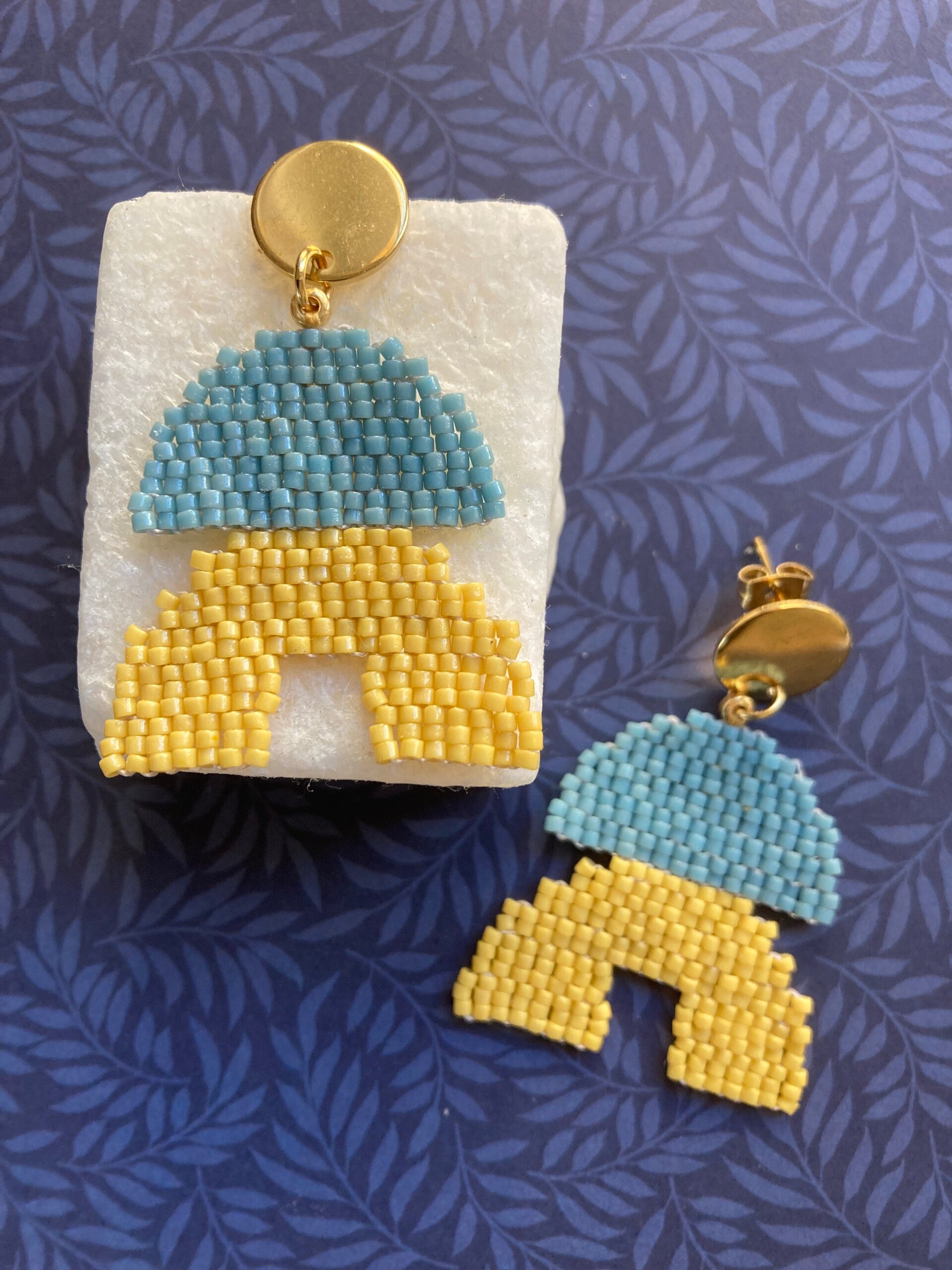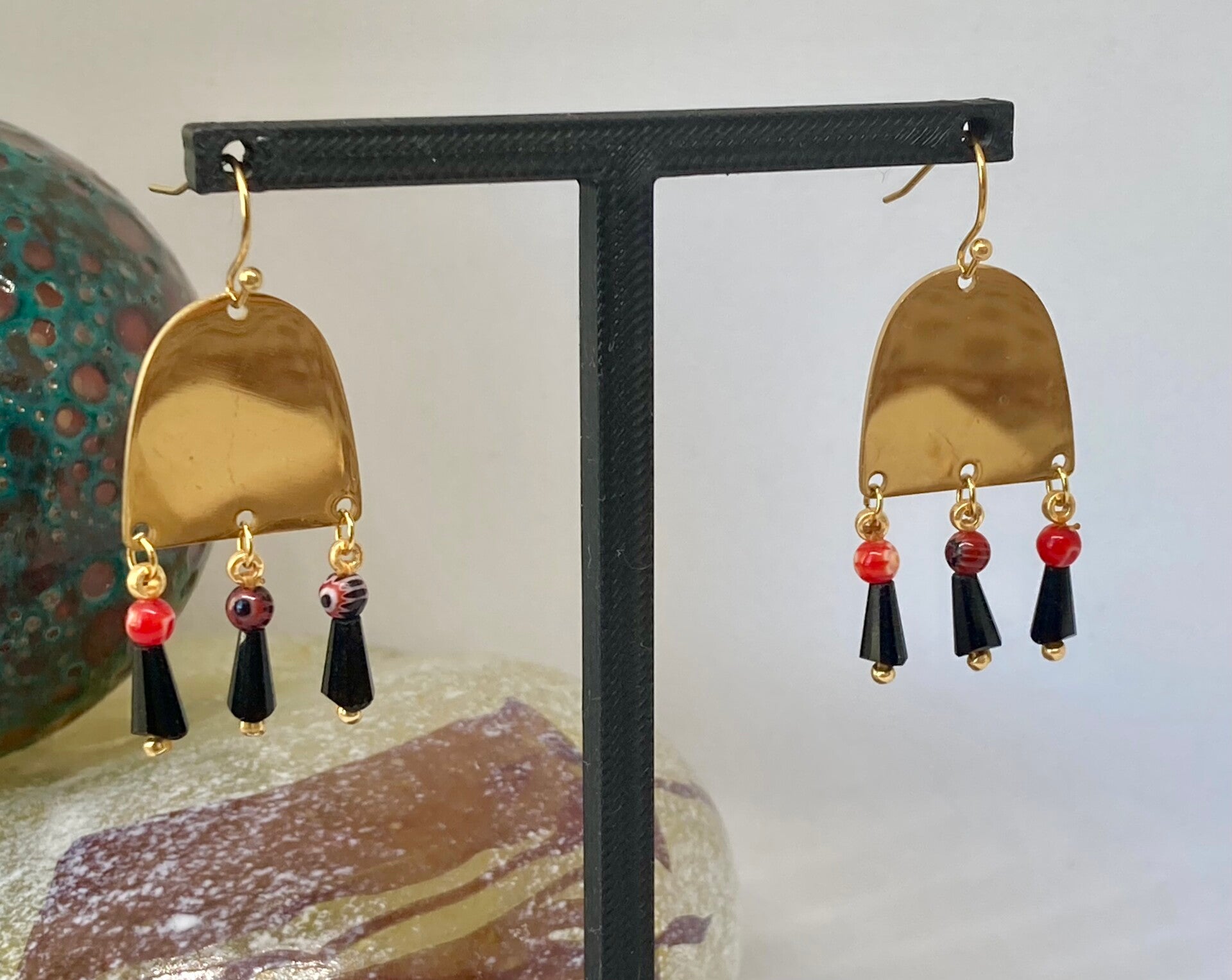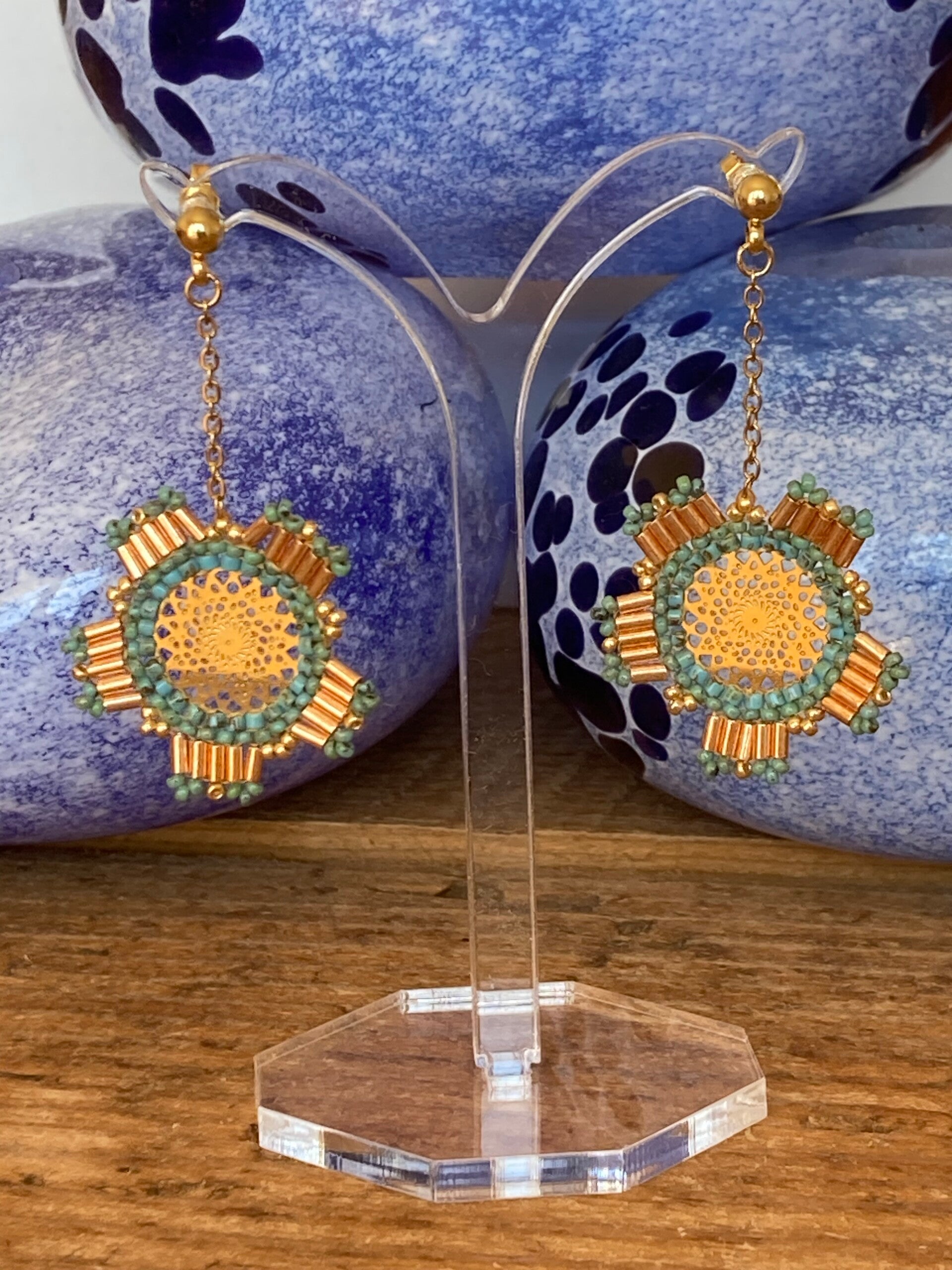 Clous d’oreilles, anneau martelé doré à l’or fin, passant en titanium, perles en verre, fil nylon