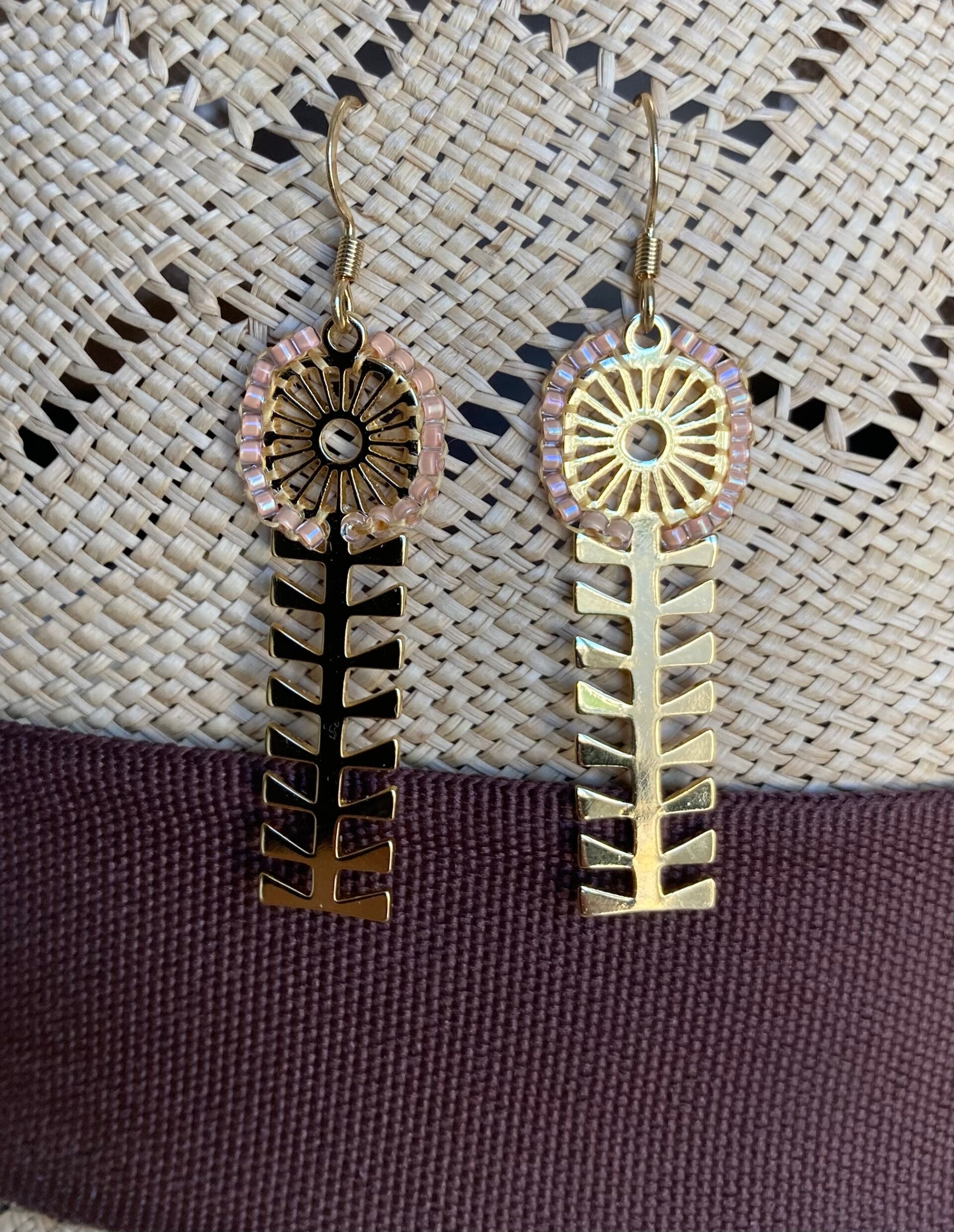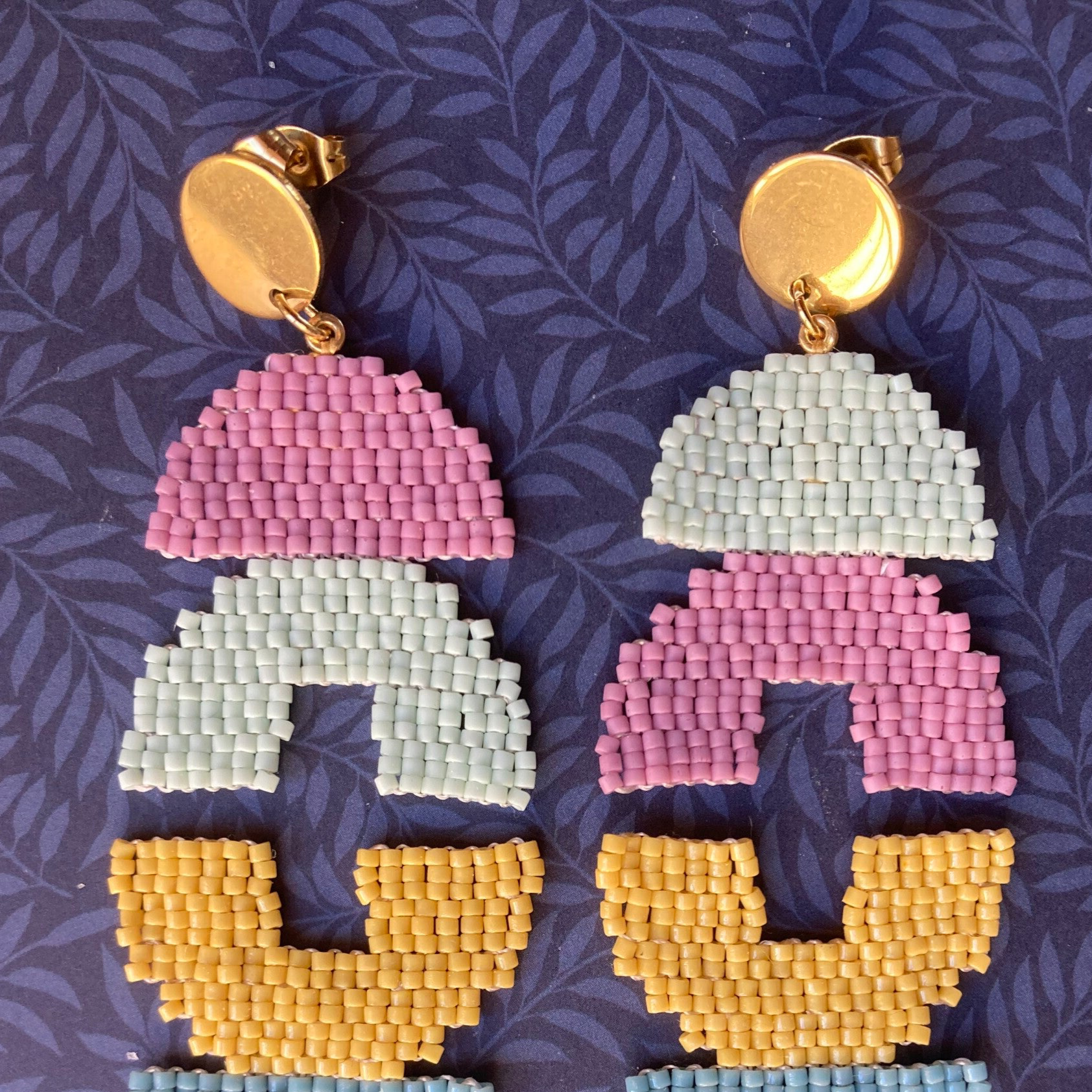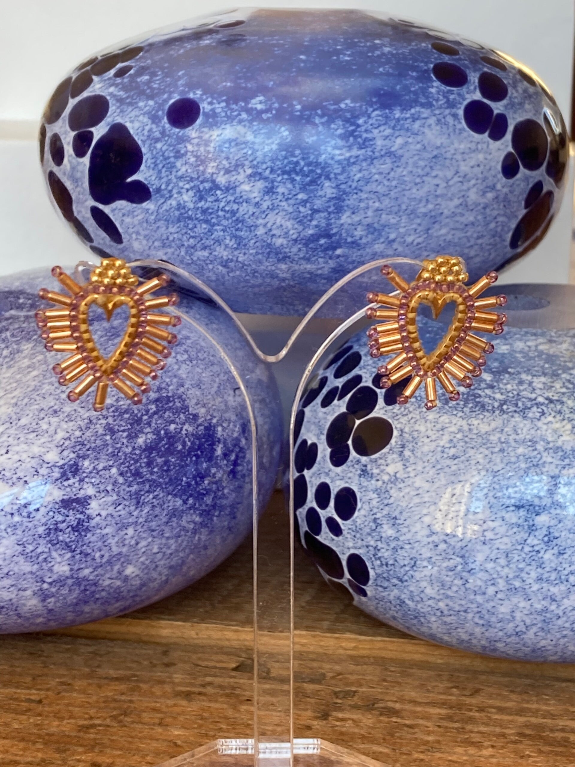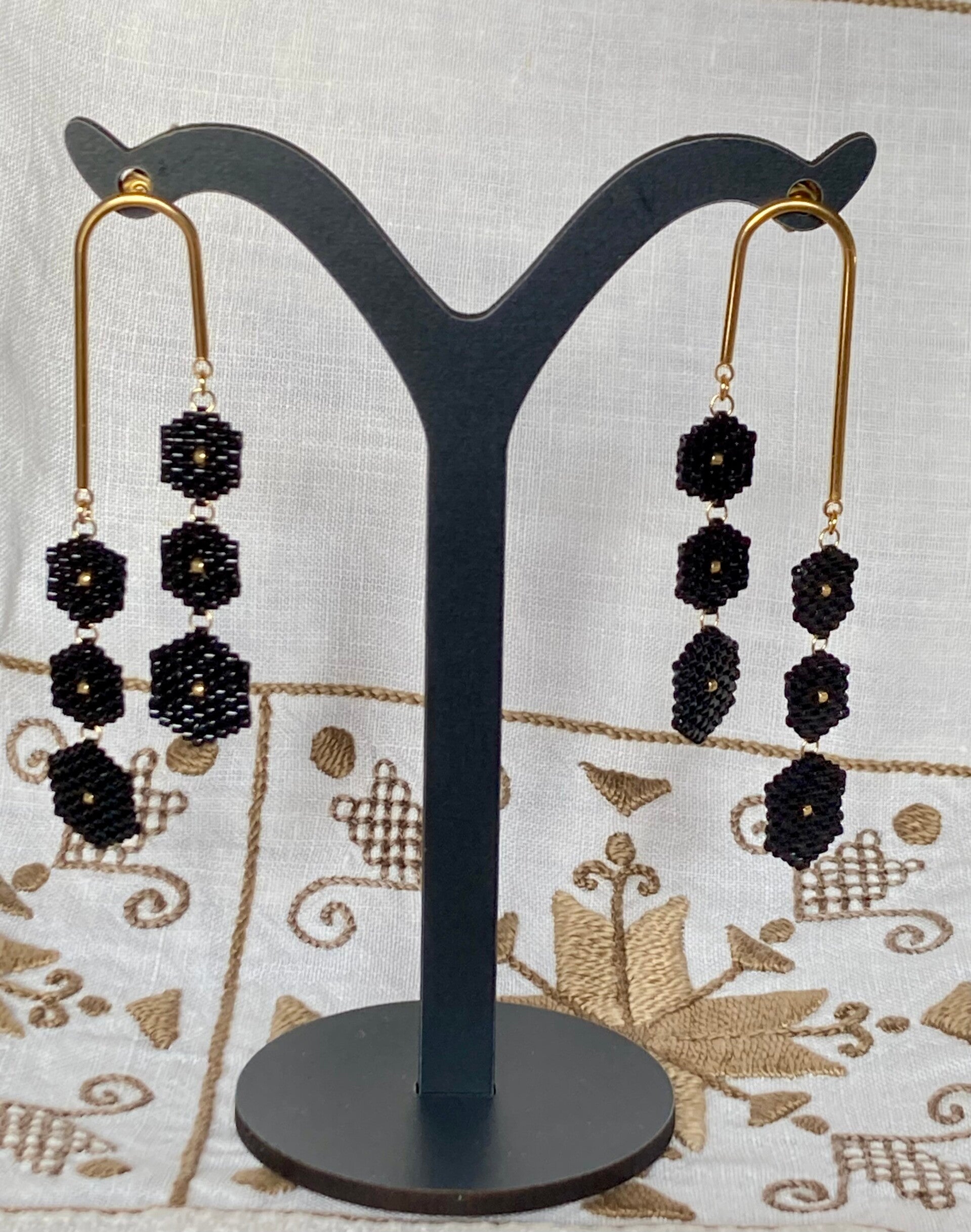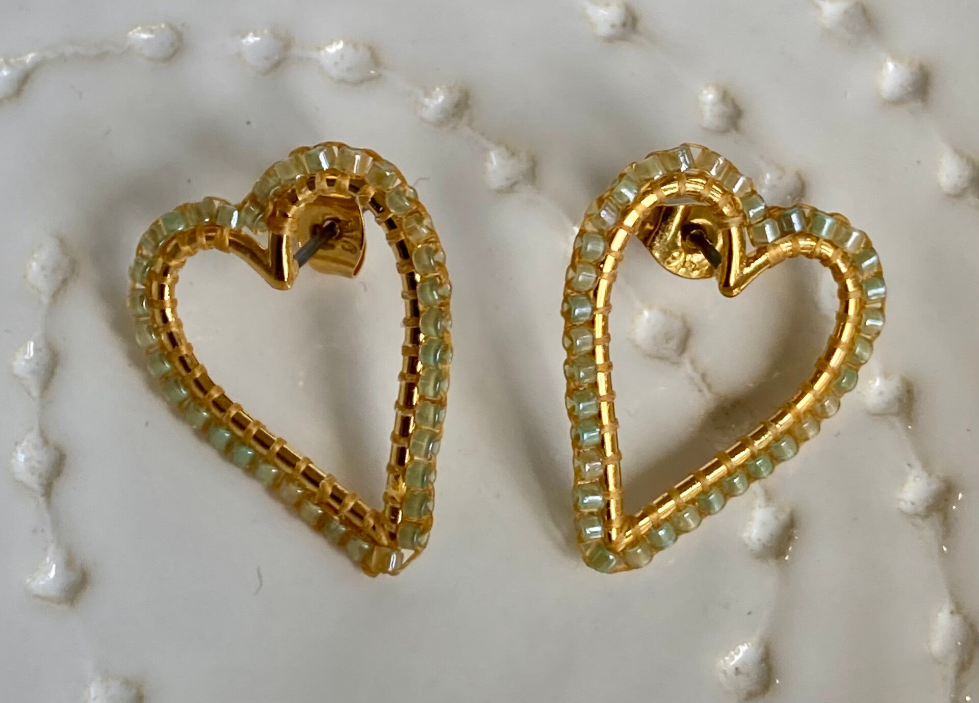 Clous d’oreilles, anneau martelé doré à l’or fin, passant en titanium, perles en verre, fil nylon