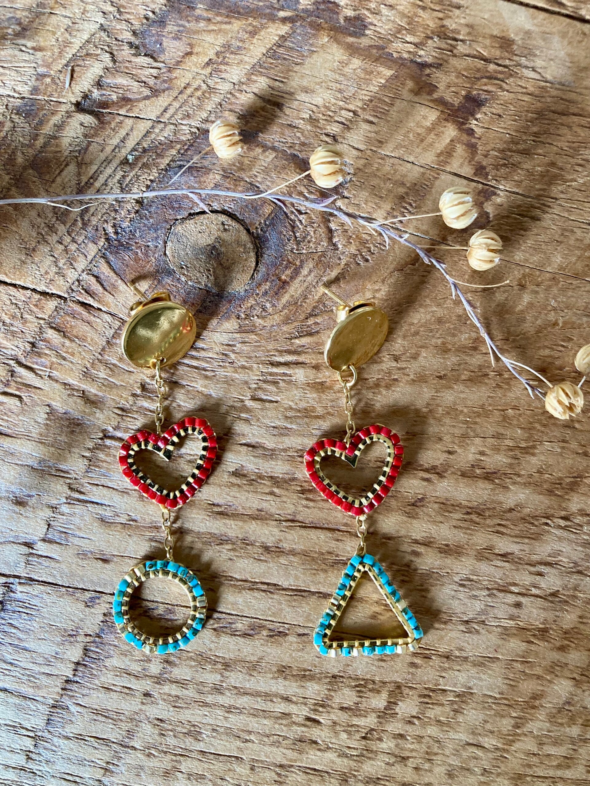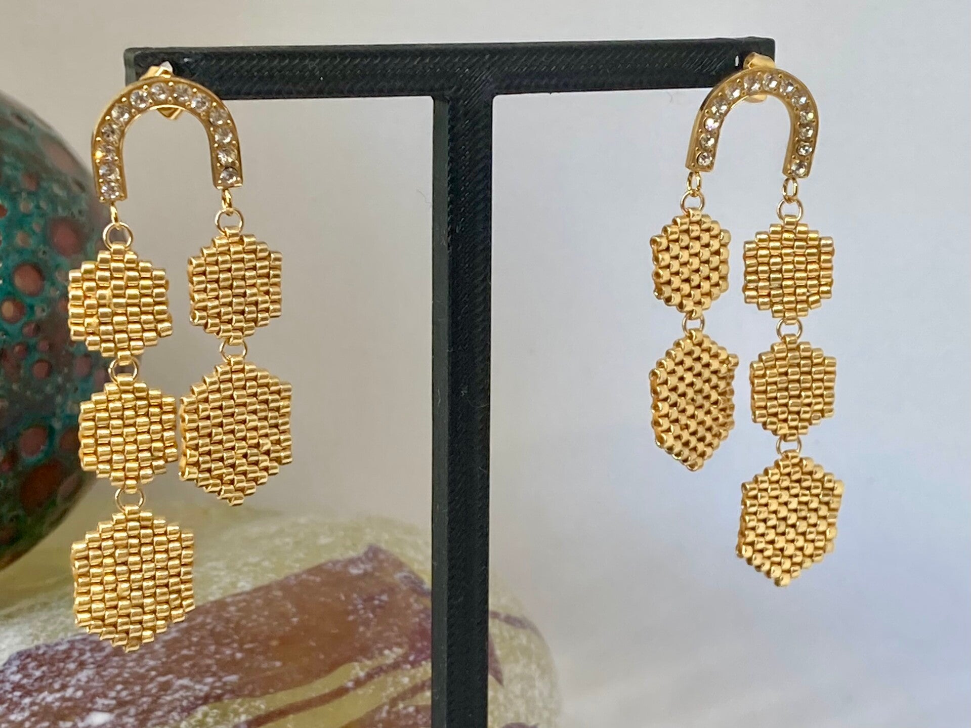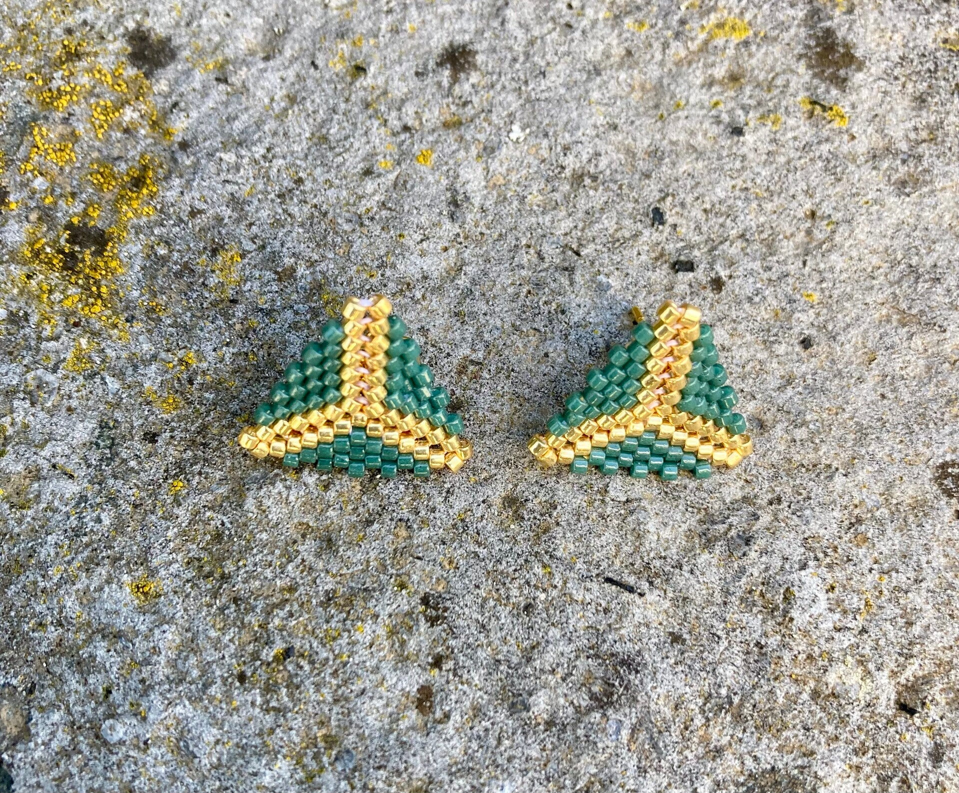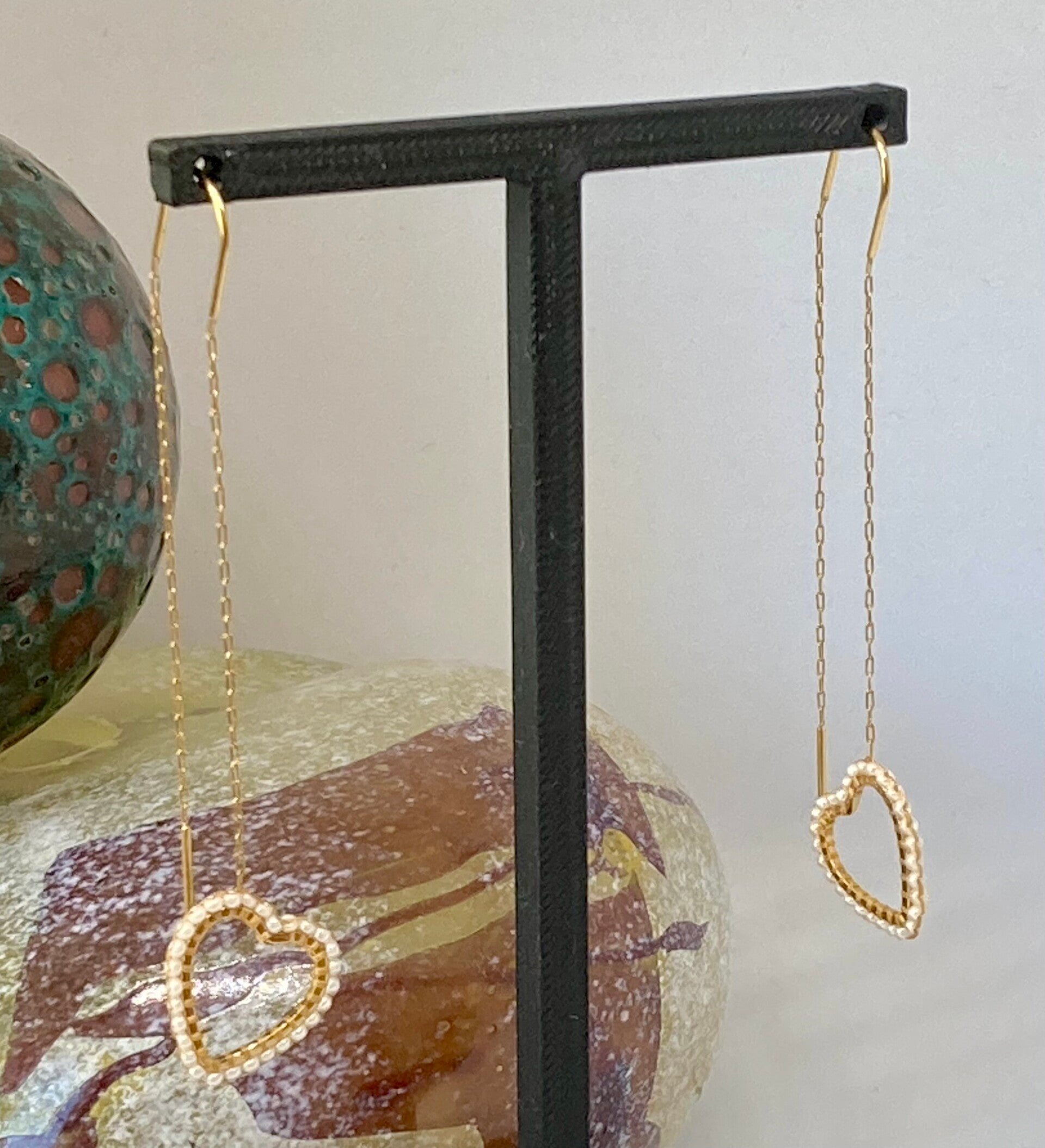 Clous d’oreilles, anneau martelé doré à l’or fin, passant en titanium, perles en verre, fil nylon