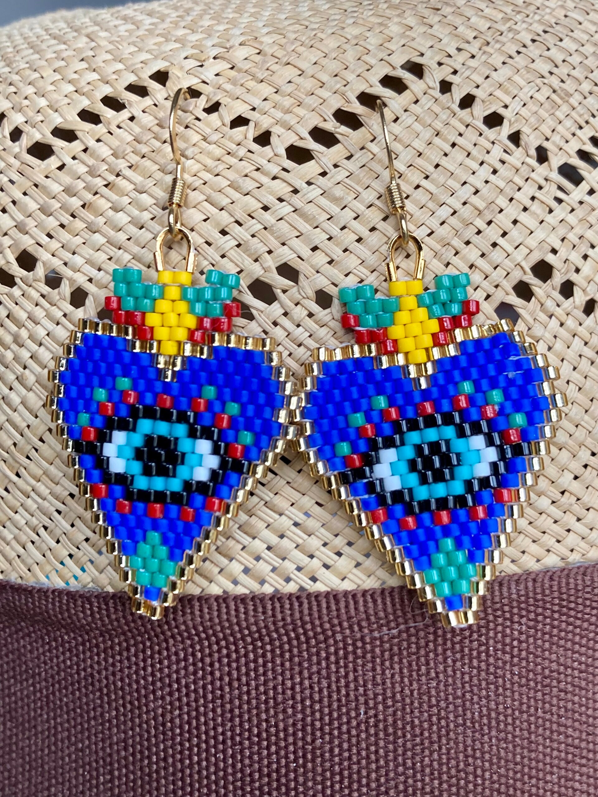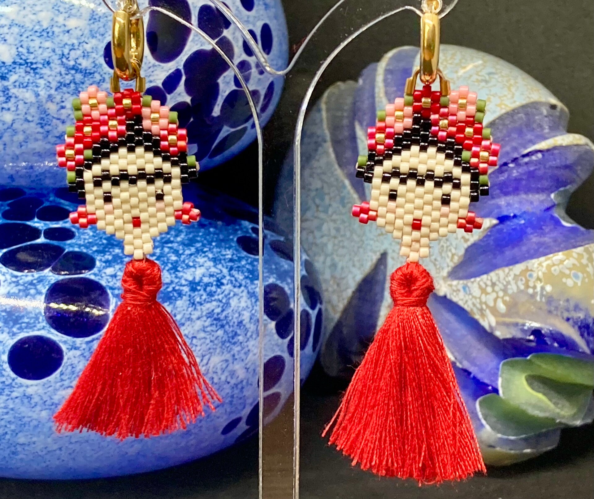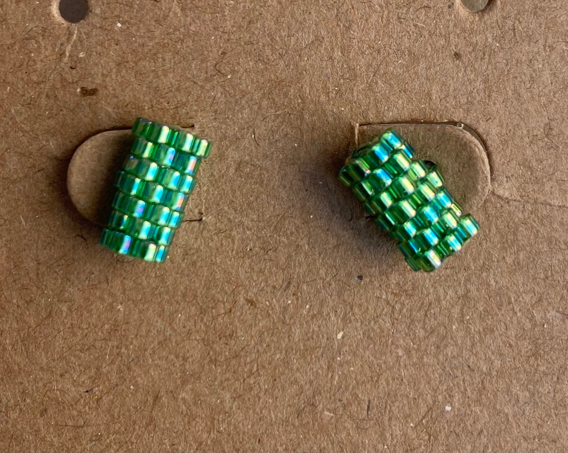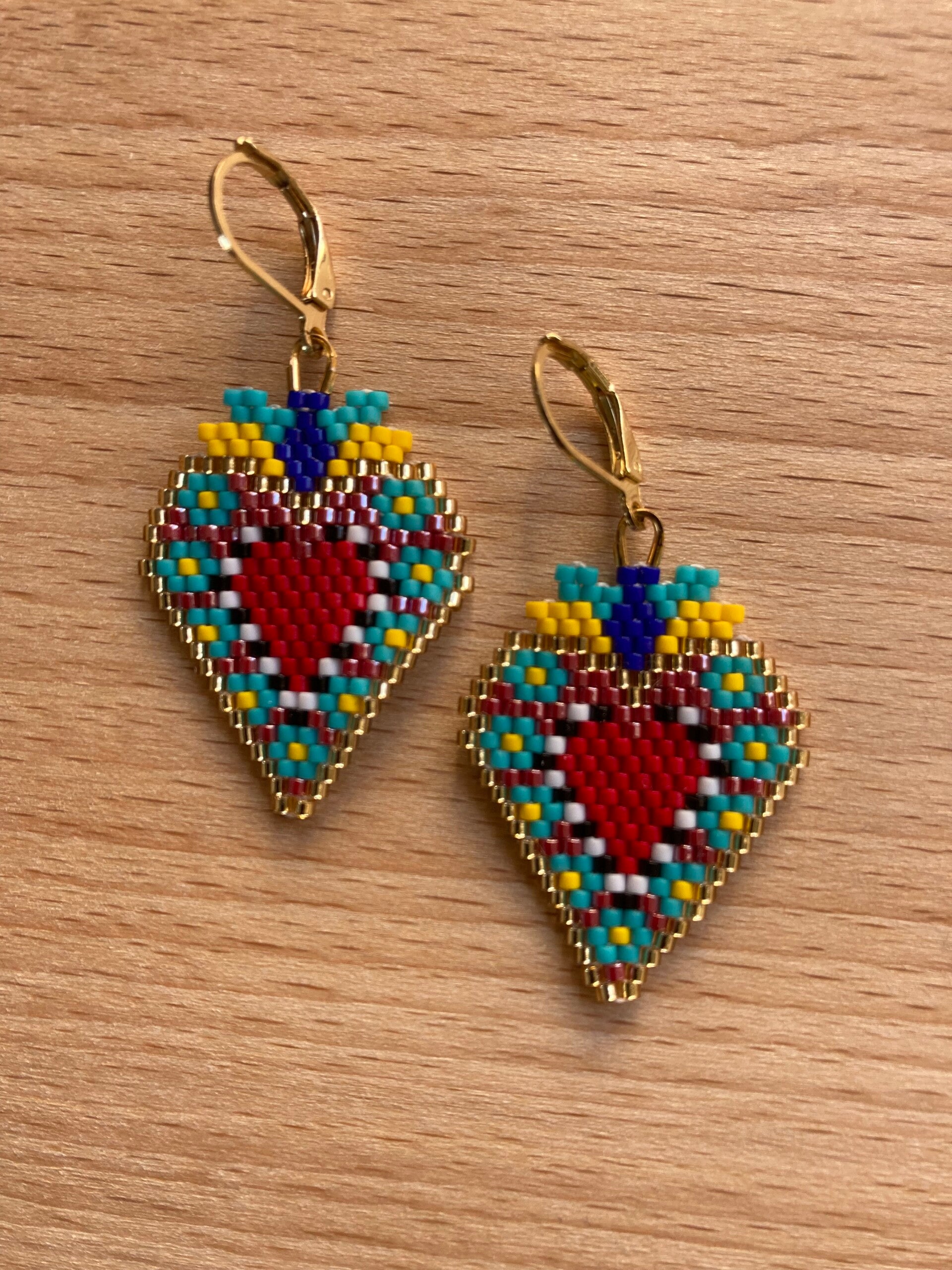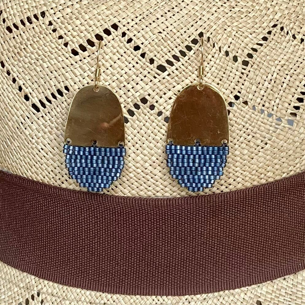 Clous d’oreilles, anneau martelé doré à l’or fin, passant en titanium, perles en verre, fil nylon